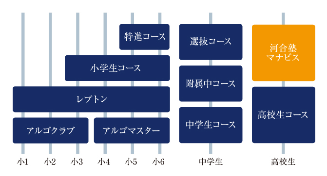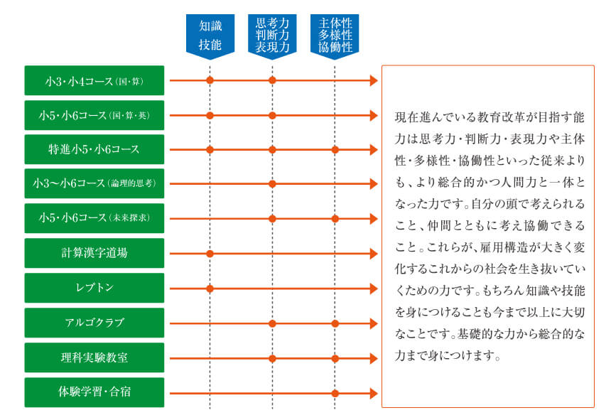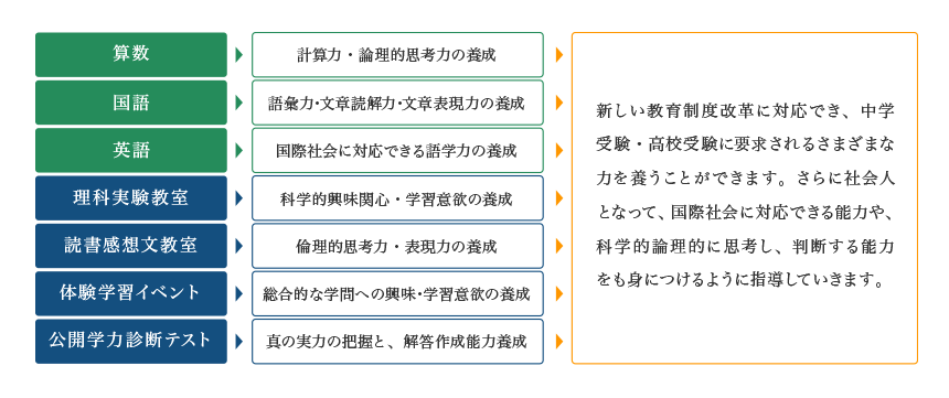 子どもたちの学習意欲を高め、主体的な学びができる素養を培っていきます。小学生低学年から、英語コース、数理能力の養成コースで、遊びの要素を取り入れつつ楽しく学習を開始します。小学生中学年以降は、算数・国語・英語の必須の基礎学力を培いながら、論理的な思考力、主体的に学ぶ姿勢、他者と議論する中で協働する姿勢を、授業の中で育成します。中学受験コース、プログラミングコースなど、様々なニーズに対応し、理科実験教室や夏合宿などのイベントでは、子どもたちの「人間力」を養っていきます。