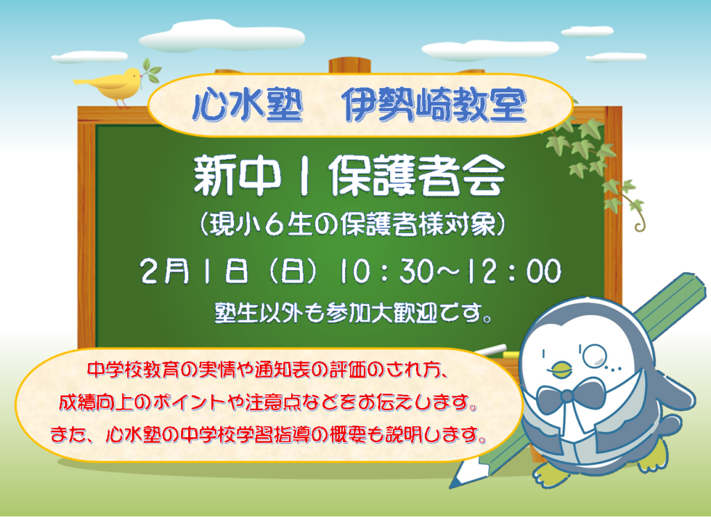 【心水塾 伊勢崎教室】新中1保護者会(現小6生対象)2/1(日)10:30~