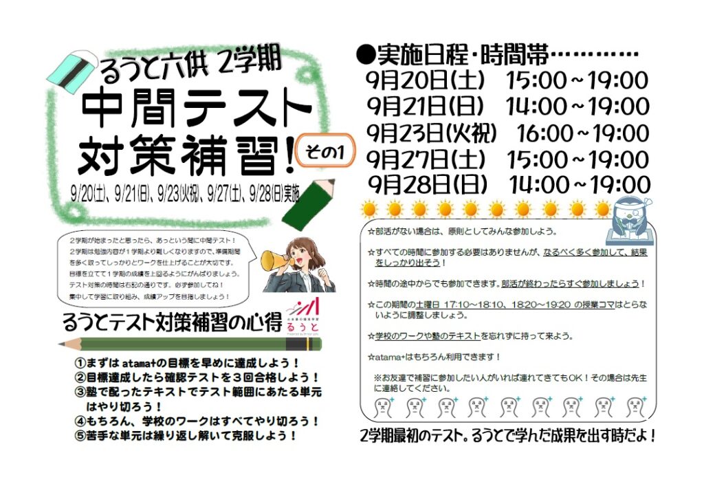 るうと六供教室では、以下の日程で「2学期中間テスト対策補習 その1」を実施します📖✎