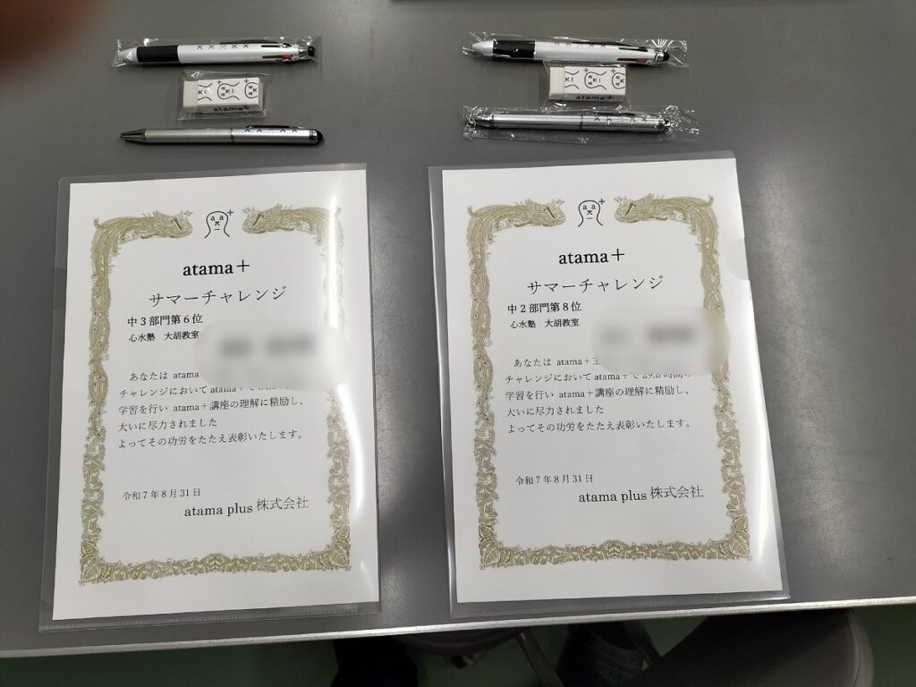 皆さんそれぞれ頑張ったのですが、その中でも、最も多くの時間を学習した生徒に、atama+本部から、「サマーチャレンジ賞」(賞状以外にすてきな文房具も!)が届けられました!