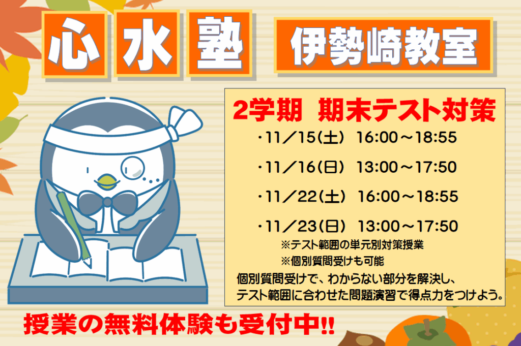 【心水塾 伊勢崎教室】2学期期末テスト対策 好評!参加受付中!