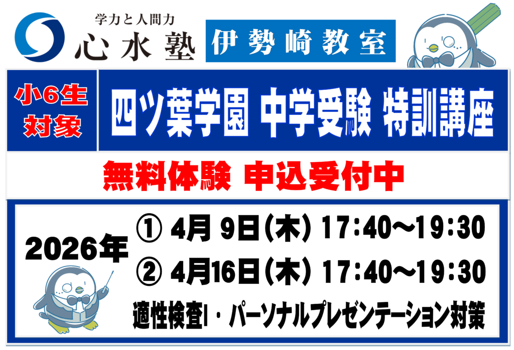 【心水塾 伊勢崎教室】四ツ葉学園 中学受験特訓(無料体験 受付中!!)